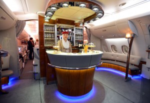 豪華な内装が自慢のエミレーツ航空のA380に設けられたファーストクラス。成田のラウンジも機内の雰囲気を取り入れた=12年7月1日 PHOTO: Tadayuki YOSHIKAWA/Aviation Wire