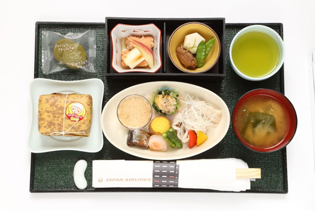 午後5時以降の出発便を対象に、上旬、中旬、下旬で異なるメニューを用意する。午後3時40分那覇発羽田行きJL914便でも提供する。