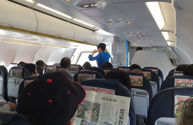 あれほど構造を熟知していると自負していた第3ターミナル。最初に乗る便から失態を演じたことに軽いショックを受けていると、優先搭乗が始まった。そして午前7時11分、全員の搭乗がスタート、同20分に機内に入った。機内を見回すと、客室乗務員がお年寄りの荷物を収納する手伝いをしていた。