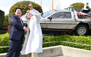 デロリアンの前でドク・ブラウン博士に出迎えられるJALの植木義晴社長(左)=15年5月 PHOTO: Tadayuki YOSHIKAWA/Aviation Wire