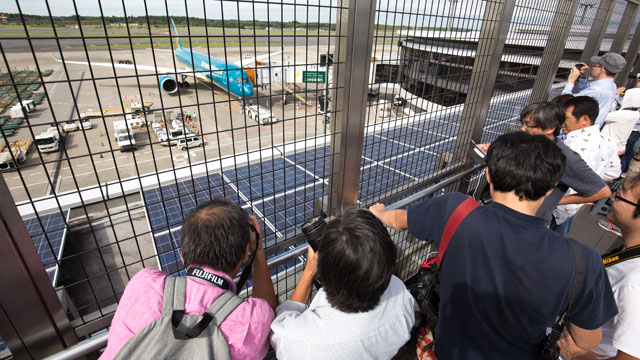 成田空港の展望デッキには、商業飛行では初飛来とあって、多くの航空ファンが詰めかけた。