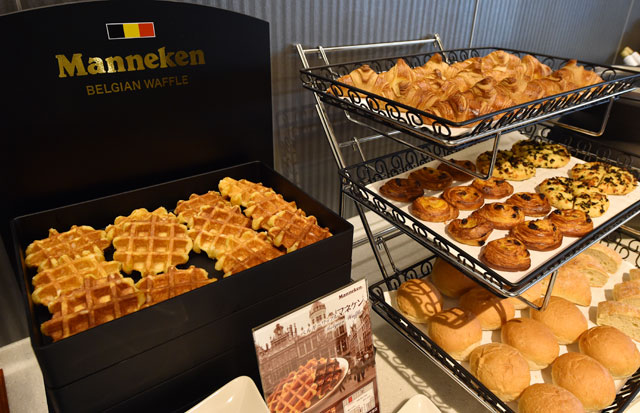 ANAがスイートラウンジで提供するプレーンワッフル(左)とパン。パンは中段と下段左側が朝、右側が夕方に提供するもので、夕方はお酒に合うものを揃える=11月3日 PHOTO: Tadayuki YOSHIKAWA/Aviation Wire