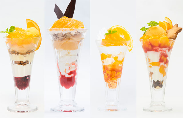 心斎橋の人気カフェ4店舗とコラボする「ジェットスターカフェ」で用意する(左から)W Cafe、TABLES、Fun Space Cafe、Brush各店のLCCパフェ(ジェットスター提供)