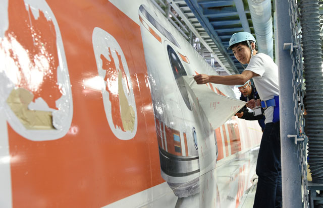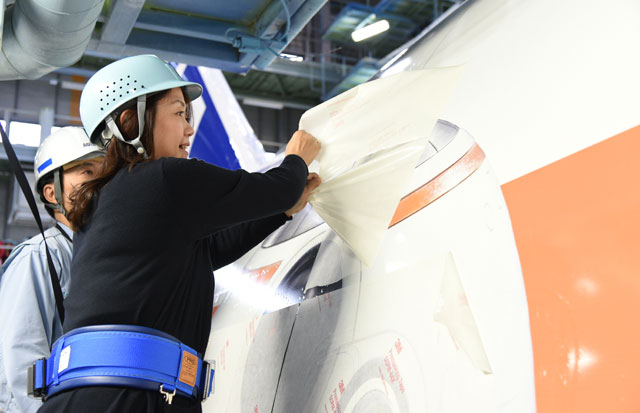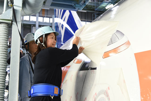 貼り付け作業は、ANAを傘下に持つANAホールディングス(9202)などが出資する、MRO(整備・修理・分解点検)を手掛ける新会社「MRO Japan(MROジャパン)」が伊丹空港に構える格納庫で実施。8日に格納庫入りした機体は、薬剤などで一度塗装をはがした後、白やブルーなどの塗料を塗った上でクリアコートを施し、18日からは塗装の上にデカールを貼っている。