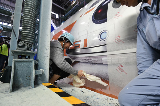 格納庫でスター・ウォーズジェットを見学した参加者のうち、3組6人がデカールの保護シートをはがす仕上げ作業を体験。機体右後方に貼られた「BB-8」のデカールの上に貼られていた保護シートをはがすと、これまでうっすらと見えていたBB-8が姿を表わした。