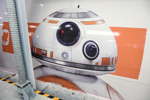 保護シートがはがされて姿を現したBB-8のデカール=11月19日 PHOTO: Motoyoshi OHMURA/Aviation Wire