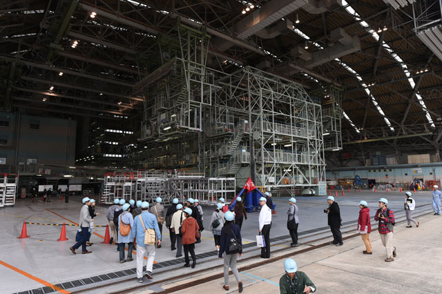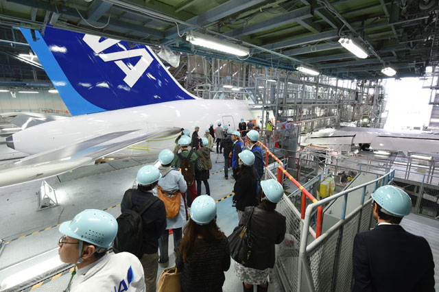 作業が行われているMROジャパンの格納庫を見学するFacebookイベントの参加者=11月19日 PHOTO: Motoyoshi OHMURA/Aviation Wire