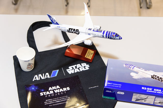 Facebookイベントの参加者に配られたR2-D2ジェット非売品模型などのおみやげ=11月19日 PHOTO: Motoyoshi OHMURA/Aviation Wire