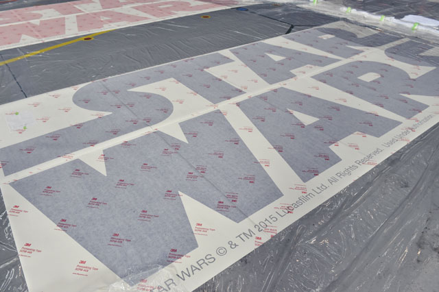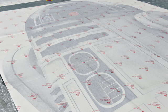 18日にスタートしたデカール貼りは、機体後部から作業を行い、位置決めや仮貼りをしてから貼り付けられた。その後、19日に参加者が保護シートをはがしたのは、機体右後方に貼られた「BB-8」のデカール。白い塗料が塗り直され、クリアコートが施された機体にオレンジ色の帯のデカールが貼られ、その上にBB-8のデカールが重ねられた。