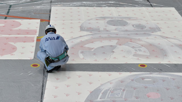 伊丹の格納庫に用意されたスター・ウォーズジェットに貼るデカール=11月18日 PHOTO: Tadayuki YOSHIKAWA/Aviation Wire
