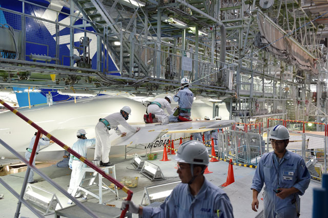 貼り付け作業は、ANAを傘下に持つANAホールディングス(9202)などが出資する、MRO(整備・修理・分解点検)を手掛ける新会社「MRO Japan(MROジャパン)」が伊丹空港に構える格納庫で実施。8日に格納庫入りした機体は、薬剤などで一度塗装をはがした後、白やブルーなどの顔料系塗料を塗った上でクリアコートを施し、18日から塗装の上にデカールを貼っている。完成した機体は、21日午後にお披露目され、22日午前7時30分に伊丹から羽田へ出発する。