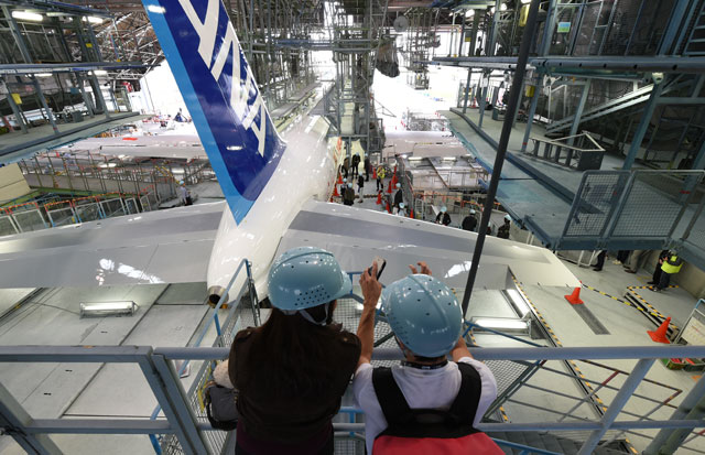 お披露目前の19日、ANAではFacebook(フェイスブック)ファン向けのイベントとして、ひと足早く機体が見られる見学会を開いた。900人を超える応募の中から抽選で選ばれた27人は、デカールの一部を貼り終えたばかりの機体と記念撮影するなど、普段は立ち入れない格納庫内を堪能していたようだった。参加者のうち3組6人は、デカールの保護シートをはがす仕上げ作業を体験した。