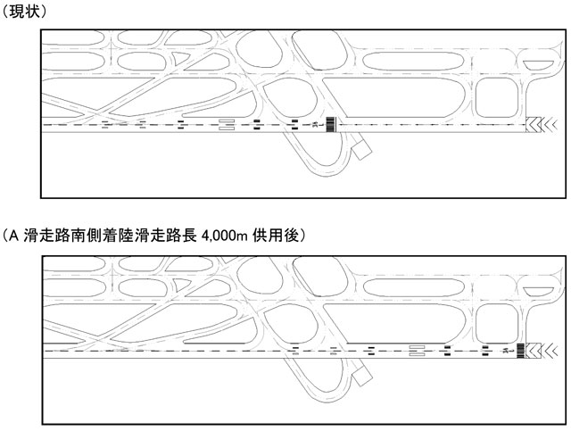 A滑走路南側の現状(上)と着陸滑走路4000m化後(NAAの資料から)
