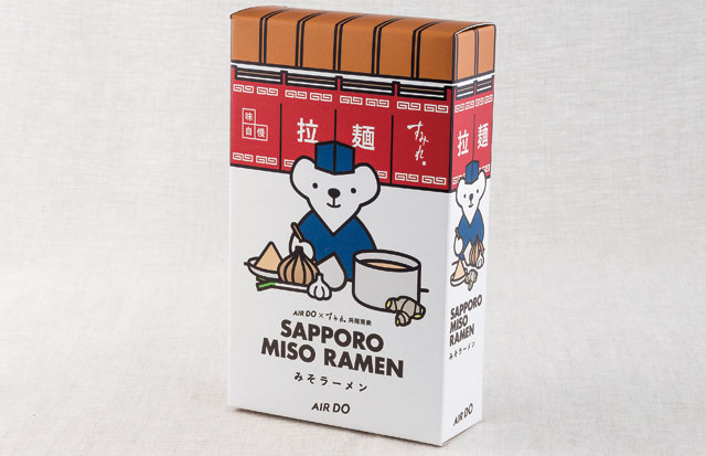すみれは、1964年に札幌の中之島で創業。名店の味を家庭で再現できるようにした。ラーメン3食セットを、同社のマスコットキャラクター「ベア・ドゥ」を描いたオリジナルパッケージに入れた。機内ではパッケージ販売のみで、調理した商品の提供はない。