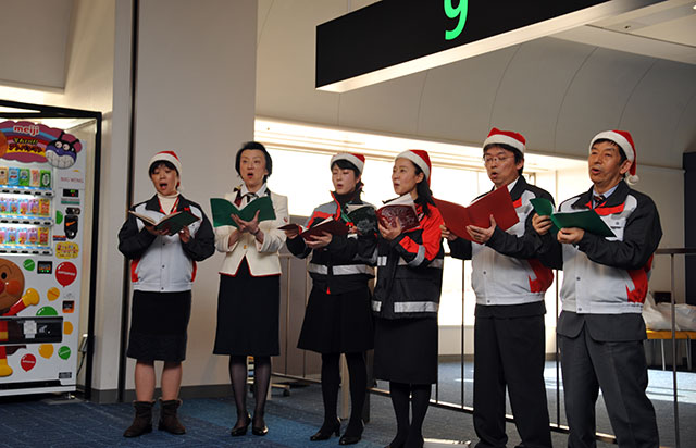 ・JALの新人CA、ミュージックベルでクリスマス 羽田で披露(15年12月24日)