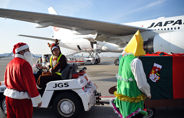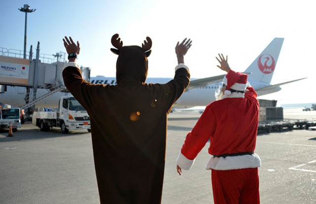 JL321便以外にも手を振るサンタとトナカイ=12月24日 PHOTO: Yusuke KOHASE/Aviation Wire