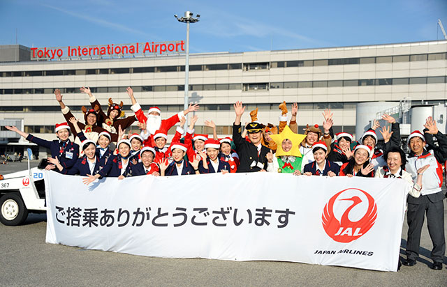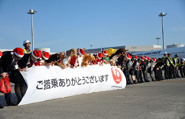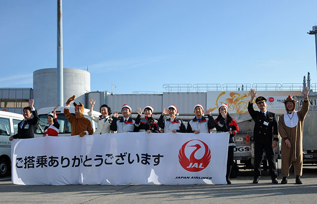 同便は前日の23日に開設した、子ども用遊戯スペース「JALキッズランド」脇の9番搭乗口を使用した。搭乗口付近では、JALグループ合唱団フロイデが『もろびとこぞりて』や『もみの木』などのクリスマスソングをアカペラ演奏で披露。利用客を見送った。地上係員をはじめとするスタッフは、チョコやキャンディなどの菓子とクリスマスカードを利用客に配付した。