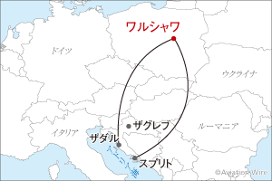LOTポーランド航空が乗り入れるクロアチア路線(Aviation Wire作成)