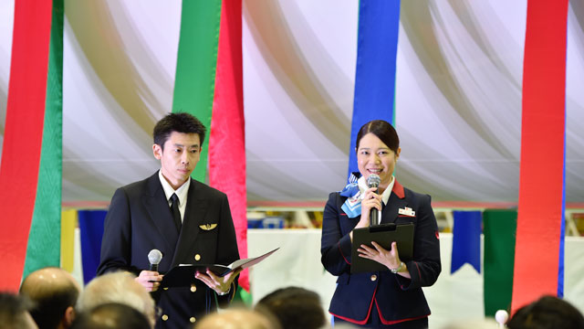 記念式典で司会するJTAのパイロット(左)と客室乗務員=16年2月2日 PHOTO: Tadayuki YOSHIKAWA/Aviation Wire
