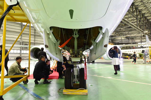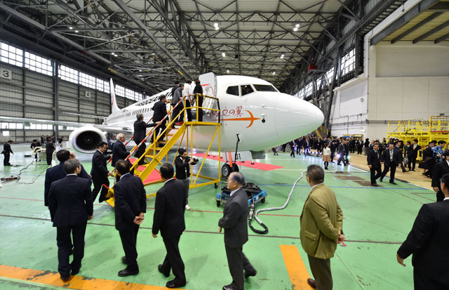JTAの737-800初号機を見学する式典参加者=16年2月2日 PHOTO: Tadayuki YOSHIKAWA/Aviation Wire