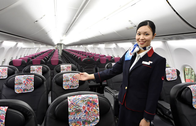 また、沖縄らしさを乗客に体感してもらうため、クラスJのヘッドレストカバーには、沖縄の伝統工芸「紅型」デザインを採用。LED照明のパターンは、JALが沖縄路線で展開するものに加えて、JTA独自の「エメラルドグリーン」を用意する。機内エンターテインメントのビデオやオーディオの番組も、沖縄らしいものを揃える。