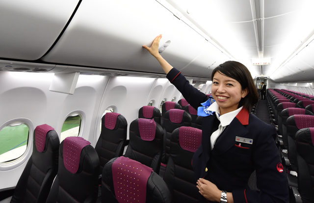 JTAの737-800初号機の手荷物収納棚を示す客室乗務員=16年2月2日 PHOTO: Tadayuki YOSHIKAWA/Aviation Wire