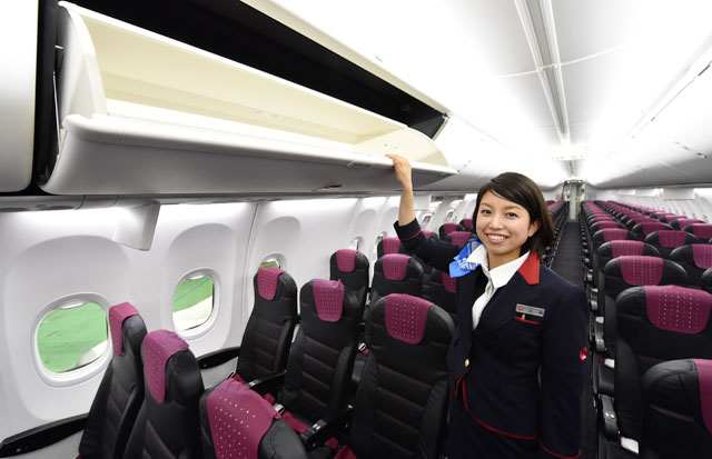 JTAの従来機より大型化した737-800初号機の手荷物収納棚を開ける客室乗務員=16年2月2日 PHOTO: Tadayuki YOSHIKAWA/Aviation Wire