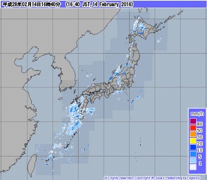 2月14日午後4時40分現在の気象庁降水ナウキャスト(同庁サイトから)