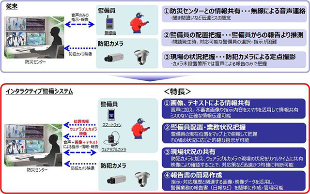 従来は警備員が持つ無線機のみでやりとりをしていた。また、防犯カメラは固定された位置にあり、未設置の場所では音声のみの報告しかできなかった。実証実験では、防犯カメラに加え警備員がカメラを装着。文字情報での指示・報告も導入し、多角的な警備システムの構築を目指す。