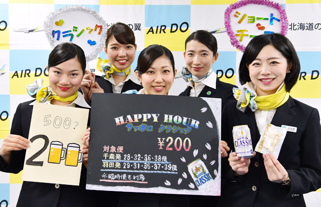 エア・ドゥ(ADO/HD)は3月1日から、夕方以降の便でビールを割引販売する「ハッピーアワー」を始める。通常500円のビールを、半額以下の200円で販売する。