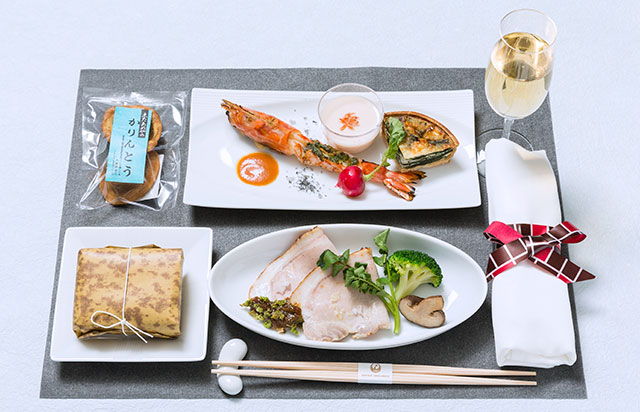 国内線ファーストクラスの機内食は、岩手・田野畑村のレストラン「ロレオール」の伊藤勝康シェフがプロデュース。上旬は「佐助豚」の麹風味ローストを、中旬は「岩手がも」のもも肉のコンフィのほか、いも粉と田野畑村の「山地酪農牛乳」を使ったクレープを、下旬は「いわて短角和牛」の山ぶどうワイン煮込みを提供する。このほか、ひと月を通じてエビのハーブ焼きも提供する。
