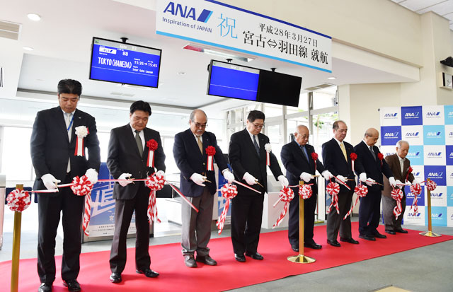 宮古空港で開かれた羽田線就航記念式典でテープカットする地元関係者=16年3月27日 PHOTO: Tadayuki YOSHIKAWA/Aviation Wire