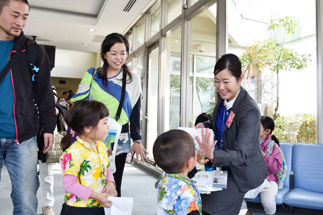 宮古発羽田行き初便に搭乗する男の子に記念品をプレゼントし、[caption id="attachment_85572" align="aligncenter" width="640"]
