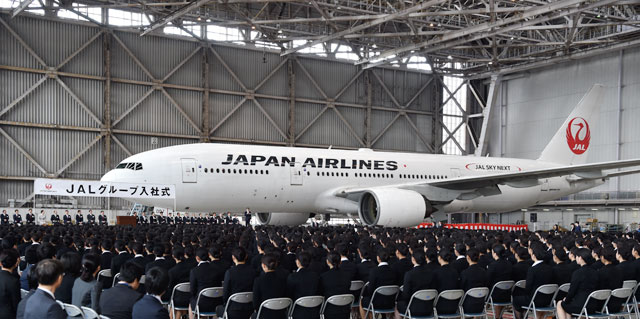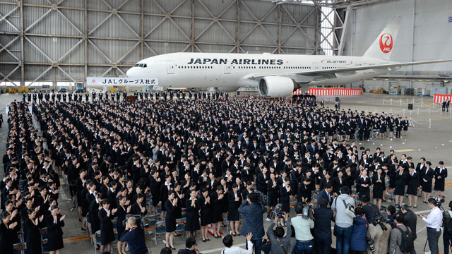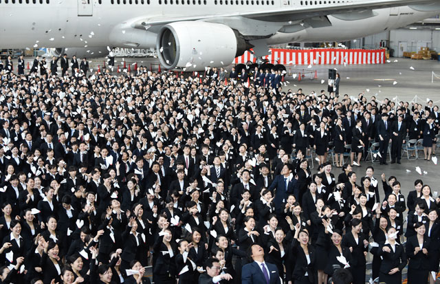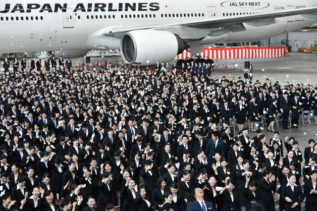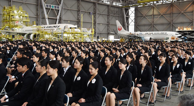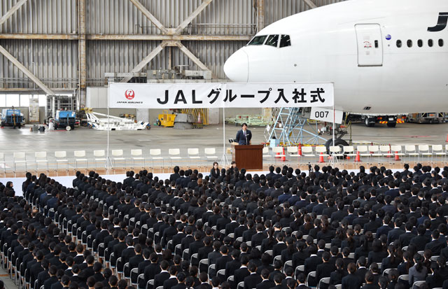 羽田の格納庫で開かれたJALの入社式=16年4月1日 PHOTO: Tadayuki YOSHIKAWA/Aviation Wire