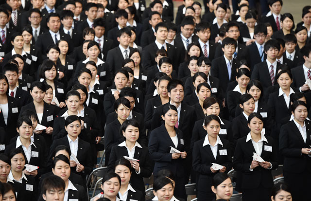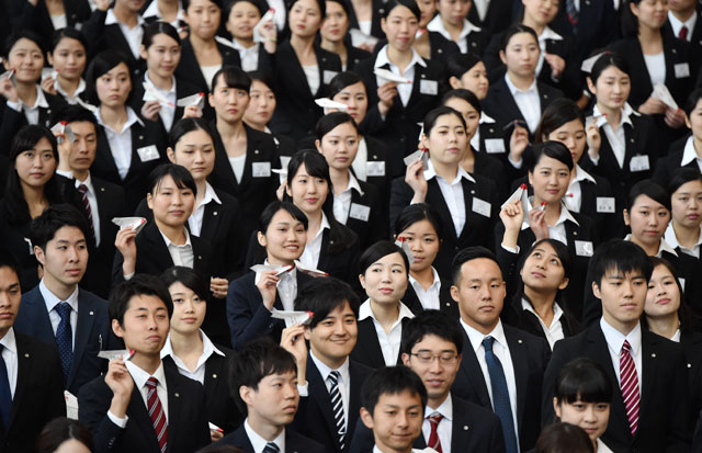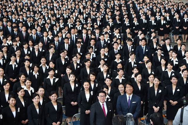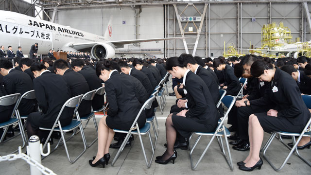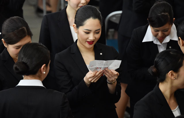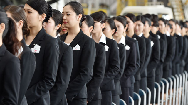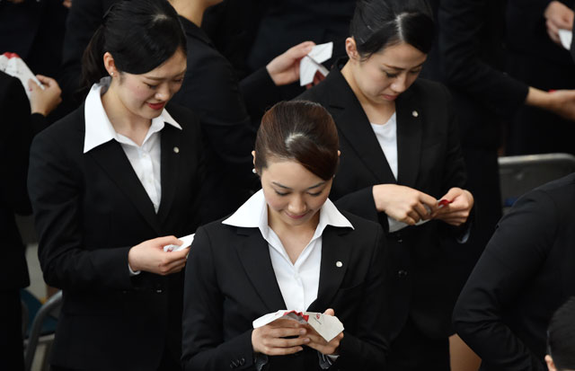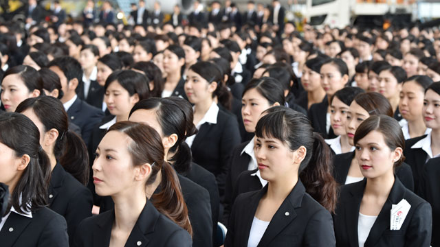 緊張した面持ちで入社式に臨むJALの新入社員=16年4月1日 PHOTO: Tadayuki YOSHIKAWA/Aviation Wir