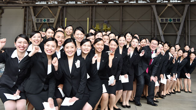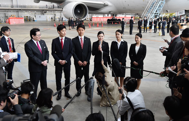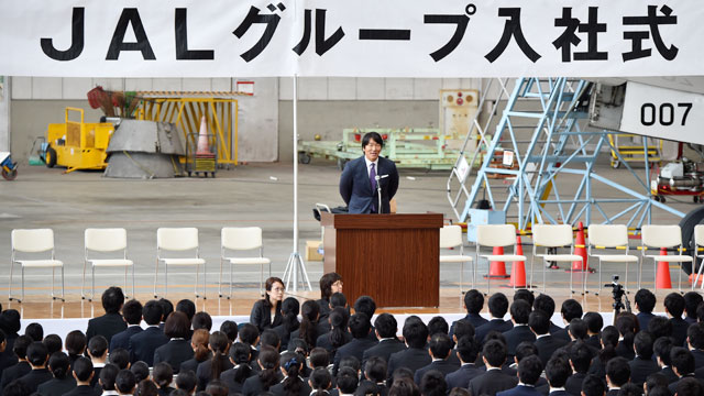 新入社員代表の木下隼斗さん(業務企画職事務系)は「挑戦」、豊田裕史さん(同技術系)は「謙虚たるべき」、客室乗務員の草場早也佳さんは「何事も一歩一歩」、運航乗務員訓練生の多田麻里子さんは「感謝の心を忘れない」、JALスカイの地上旅客係員の南文乃さんは「ひとり一人がJAL」と、モットーを語った。