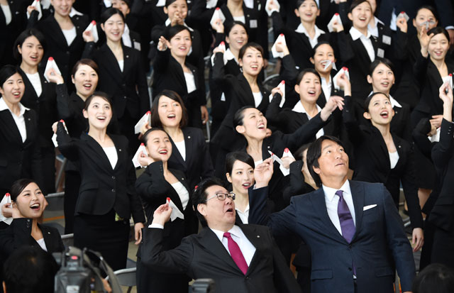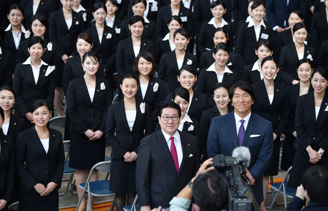 JALの植木社長や新入社員とともに並ぶ特別ゲストの松井氏=16年4月1日 PHOTO: Tadayuki YOSHIKAWA/Aviation Wire