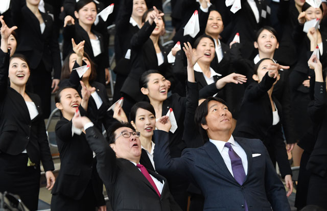 抱負を書き加えた紙飛行機を飛ばし終えたJALの新入社員=16年4月1日 PHOTO: Tadayuki YOSHIKAWA/Aviation Wire