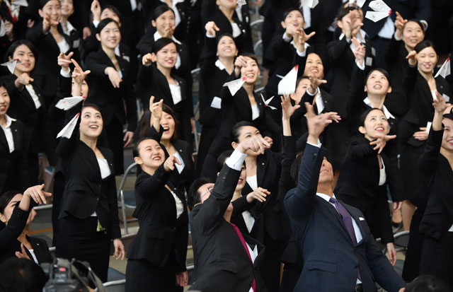 抱負を書き加えた紙飛行機を飛ばしたJALの新入社員=16年4月1日 PHOTO: Tadayuki YOSHIKAWA/Aviation Wire