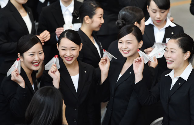 紙飛行機を手にして記念撮影するJALの新入社員=16年4月1日 PHOTO: Tadayuki YOSHIKAWA/Aviation Wire