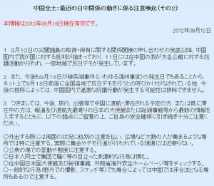 最近の日中関係の動きに係る注意喚起(外務省の海外安全ホームページから)