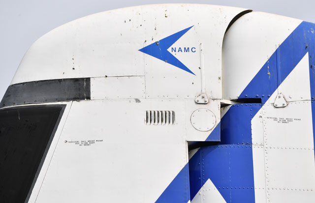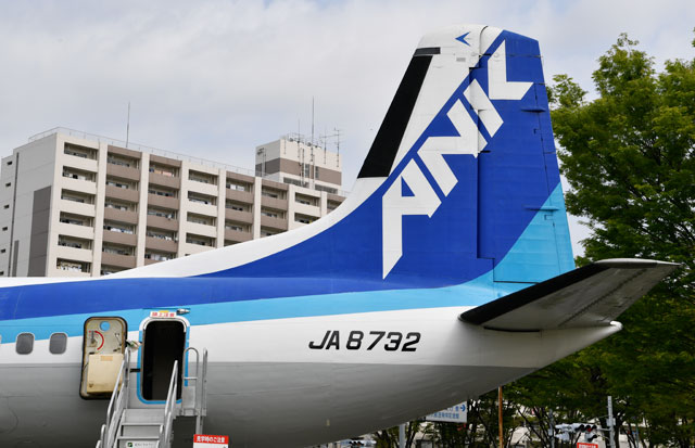 所沢航空発祥記念館が航空公園駅前に展示している元ANKのYS-11Aの垂直尾翼に描かれた日航製のロゴ=16年4月16日 PHOTO: Tadayuki YOSHIKAWA/Aviation Wire