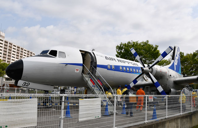 所沢航空発祥記念館が航空公園駅前に展示している元ANKのYS-11Aを見学する来場者=16年4月16日 PHOTO: Tadayuki YOSHIKAWA/Aviation Wire