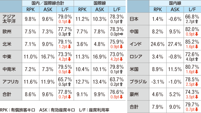 調査対象は日本を含むアジア太平洋と、欧州、北米、中東、中南米、アフリカの各地域。国際線と国内線の合計を地域別で見ると、アジア太平洋地域はRPKが