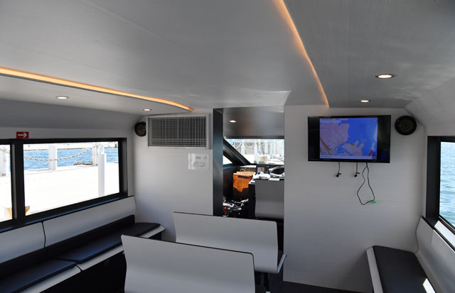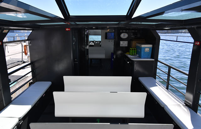 今回就航したジェットセイラーは、屋根のある50人乗り。従来は神田川などに架かる橋を通過するため、屋根のない運河船を使用していたが、雨天時の運航などの課題があったことから、第3次実験から参画するケーエムシーコーポレーションが、全高が低く橋の下を通過できるジェットセイラーを投入した。