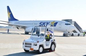 対象便は午後7時発の那覇行きBC539便と、午後8時発の神戸行きBC187便。スカイマークの地上係員や空港ガイドの「いばらきスカイガイド」らが菓子やグッズを搭乗客に配る。