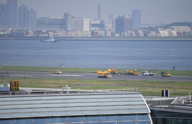 ハワイアン航空機の緊急着陸後、整備作業が進む羽田空港C滑走路=16年7月18日 PHOTO: Tadayuki YOSHIKAWA/Aviation Wire