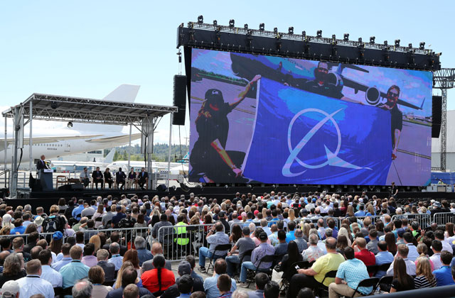 会場にはボーイングの社員や地元関係者、航空ファンが多数集まり、ボーイング家のビル・ボーイング・ジュニアさんの夫人も招かれた。また、ファンボロー航空ショーで展示飛行した、全日本空輸(ANA/NH)を傘下に持つANAホールディングス(9202)へ引き渡される787-9も展示された。