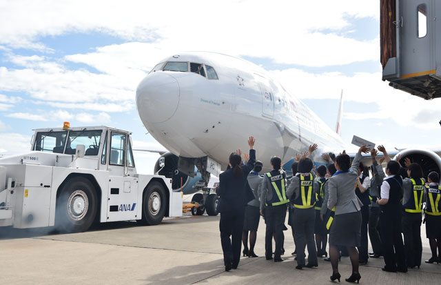 日本発最終便となった成田発ウィーン行きOS52便を見送るANAの地上旅客係員ら=16年9月4日 PHOTO: Tadayuki YOSHIKAWA/Aviation Wire