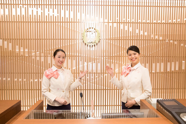 福岡空港のラウンジ受付に立つJALの係員=17年3月28日 PHOTO: Tatsuyuki TAYAMA/Aviation Wire